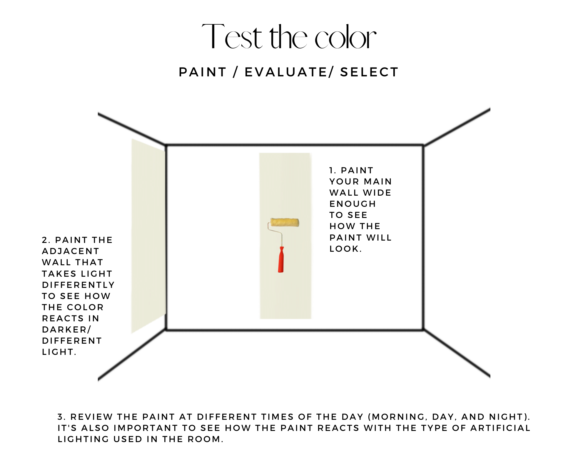 To test, you’ll want to paint a 2-foot strip on your wall from top to bottom (make sure you keep track of color name). Do this on multiple walls to see how it takes the paint and how it’s affected by the light in the room. Next is to review it at different times of day (morning, day, night). You might love it in the morning and hate it at night. You’ll also want to test it out with the light you’ll be using in the room in the evening. Doing this will ensure you select the paint that you absolutely love.