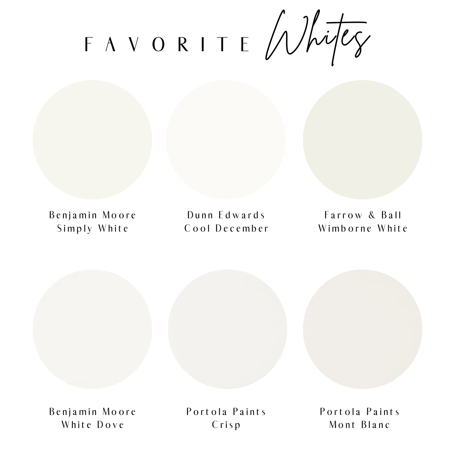 Starting things off with our favorite go-to white paints. These are beautiful off-white options that aren’t stark white and will give you a comfortable and liveable vibe. You can use these across any area of your home from walls, trims, ceilings, to even cabinetry and exterior. Before you commit, make sure to test out the colors in your own space to see how the color reacts to your home.