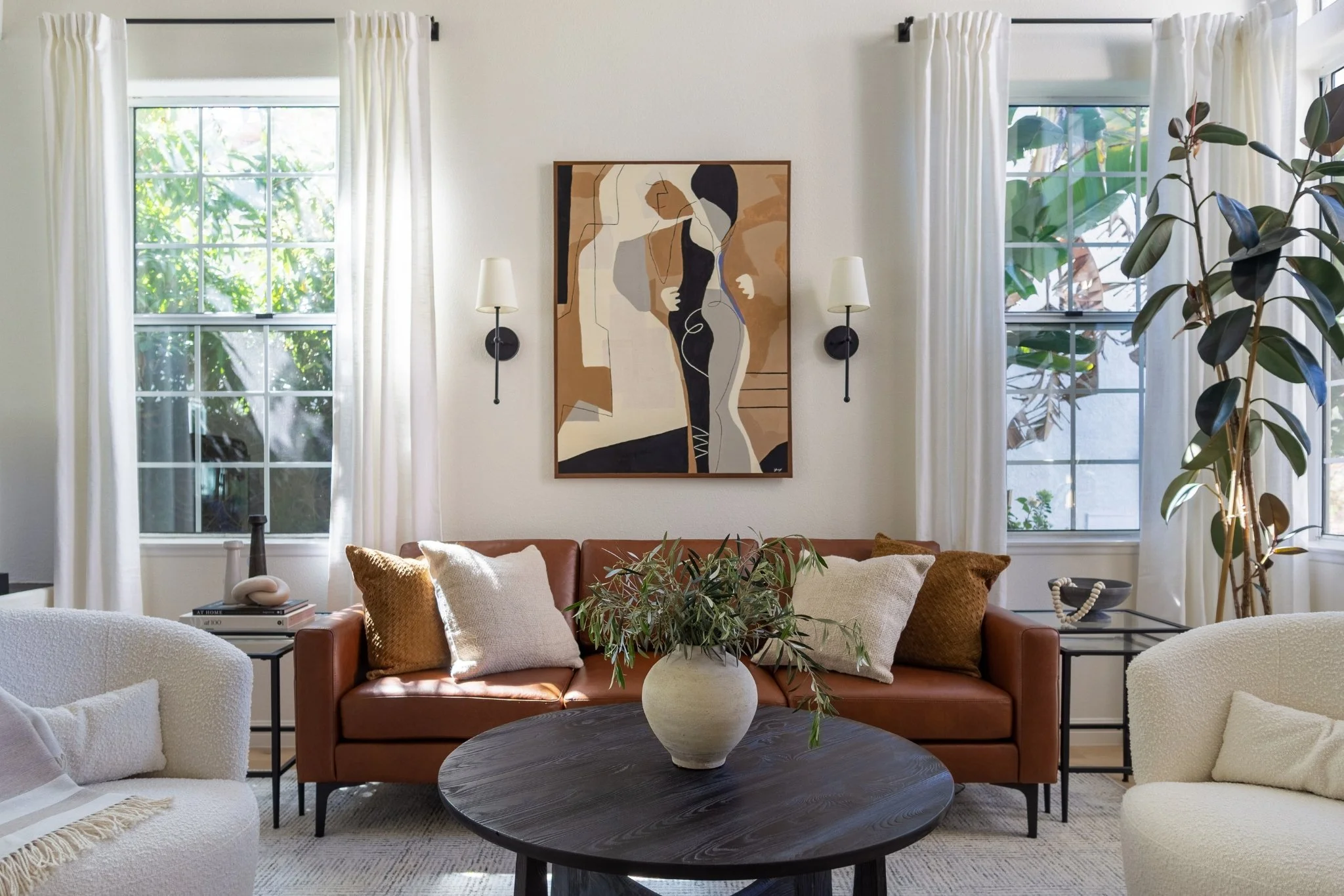 We embraced the light and airy nature of Mediterranean interior design by creating a white canvas as the foundation for the home. Natural greenery and Mediterranean-inspired artwork brought life to the space, while layered textures, such as a tan leather sofa paired with white boucle armchairs, added depth and contrast.