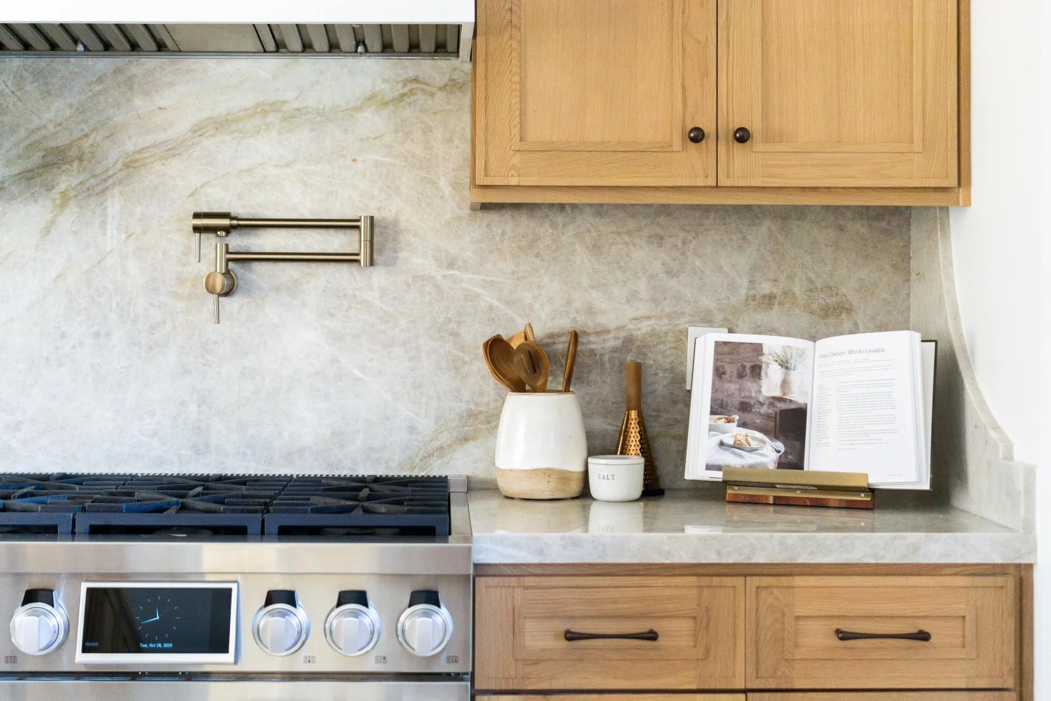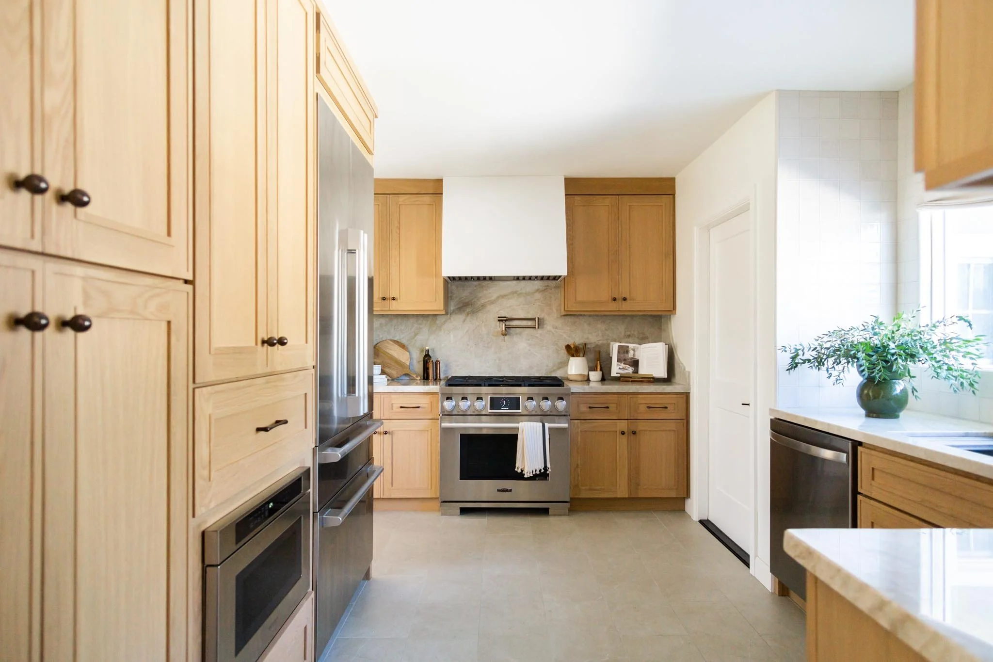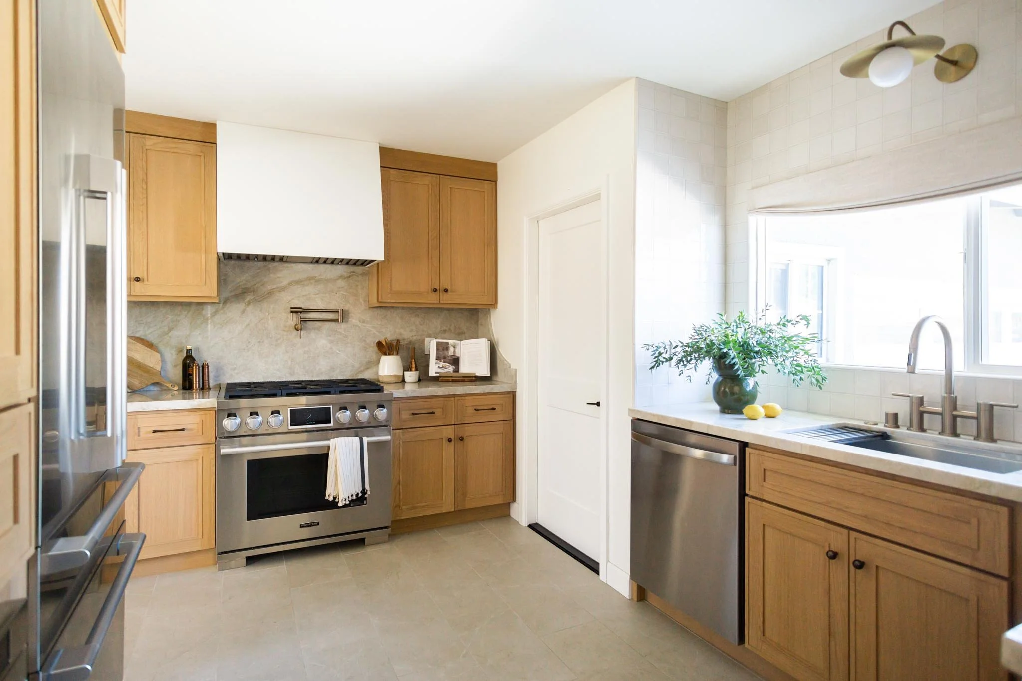 Velène Design House reimagined a California ranch kitchen, choosing an intimate layout and anchoring it with Taj Mahal quartzite, white oak cabinetry, and bespoke details to create a kitchen tailored to the family’s lifestyle.