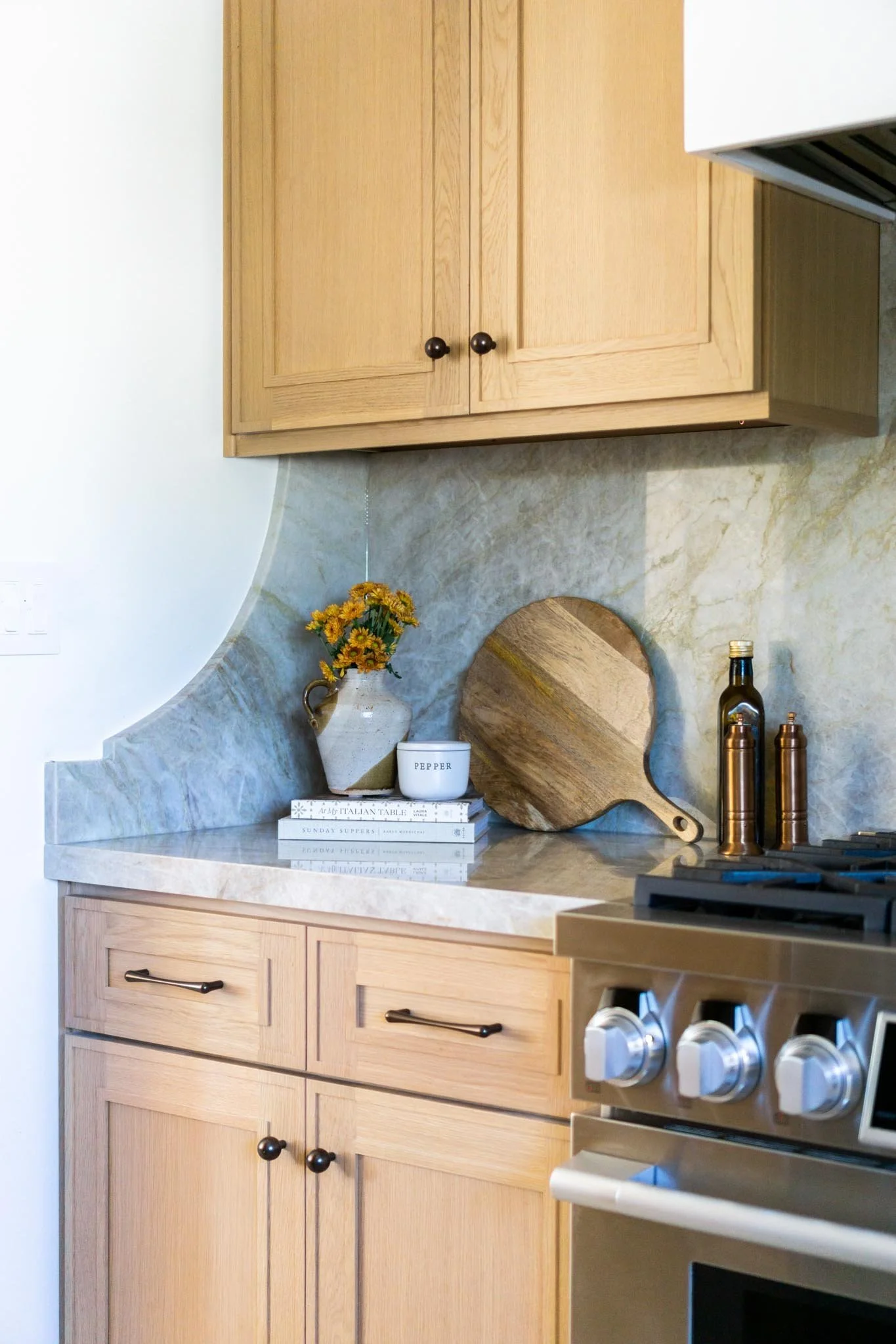 After presenting several layouts, we landed on an enclosed design to increase storage and improve circulation. We combined aged brass and oil-rubbed bronze hardware with warm wood cabinetry to create depth and warmth. Taj Mahal quartzite countertops and backsplash bring refined elegance, while handcrafted ceramic tiles and curved side splashes add bespoke texture. Integrated appliances and custom organization ensure the kitchen feels both streamlined and welcoming.